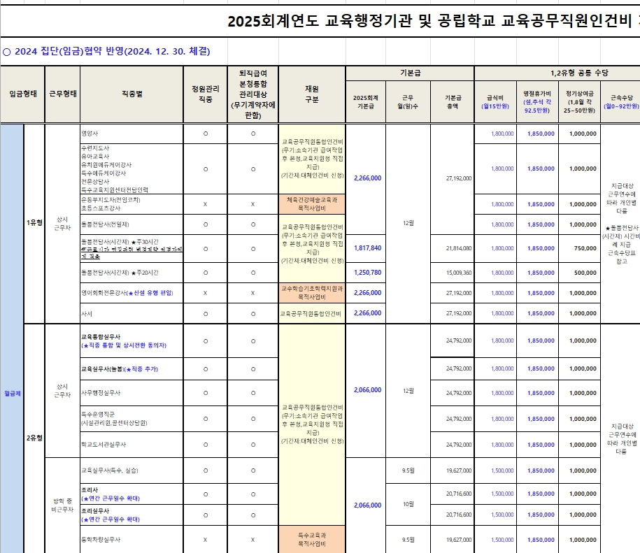 - 유형 외: 당직전담원, 미화원, 다문화강사 등 (급여는 상대적으로 낮지만 정액급식비 등 지원)